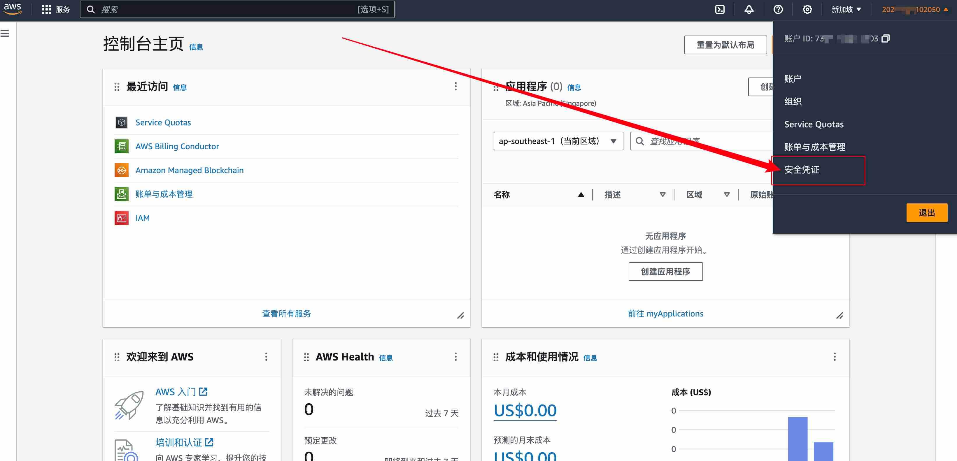 2. 在控制台顶部的导航栏中,单击您的账户名称,然后从下拉菜单中选择“我的安全凭证”。
